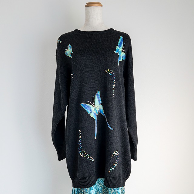 【BASEアプリでご覧のお客さまへ】 下記URLにて、さらに詳しい商品説明をご覧いただけます。 https://happydayur.kawaiishop.jp/ ※生地の質感や縫い目、編み目などが分かりやすいように、暗めに調整しているお写真もございます。 (デバイスによって差がございます) 〜こちらのお品について〜 イギリスの古着です。 エメラルグリーン、ブルー、パープルのグラデーションできれいに彩られた蝶々と、色とりどりのスパンコールとビーズが飾られている、とても素敵なニットです。 着画のように、波模様のスカートと色合いがピッタリ合うのでオススメです。 主にレーヨンの一種のビスコースと綿で作られておりますので、これからの季節に活躍するニットです。 ★カラー: 地はブラック ★サイズ(平置き): ※着画モデル:身長156cm、普段着のサイズ9号 ※下記の寸法とお手持ちの服の寸法を比較すると、サイズ感が分かりやすいです。 (着丈)約78cm (肩幅)約48cm (身幅)約50cm (袖丈)約55cm (袖幅)約26.5cm (袖口幅)約8cm ★素材: ビスコース60% 綿30% アクリル10% ★重さ: 675g ★ドイツ製 ★状態: きれいです。 下記URLにて、詳しい状態をご覧いただけます。 https://happydayur.kawaiishop.jp/items/53824510 ★お手入れ方法: ビーズの装飾が施されておりますので、クリーニング店でのクリーニングをおすすめいたします。