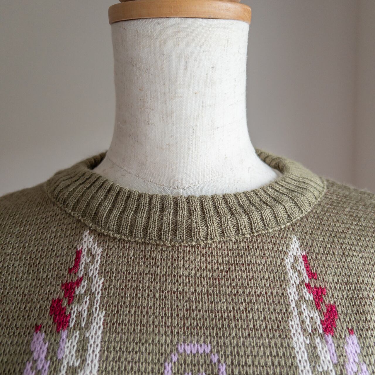 くすみカラーの中に所々入っているえんじ色が、ニット全体の色合いのアクセントになっています。