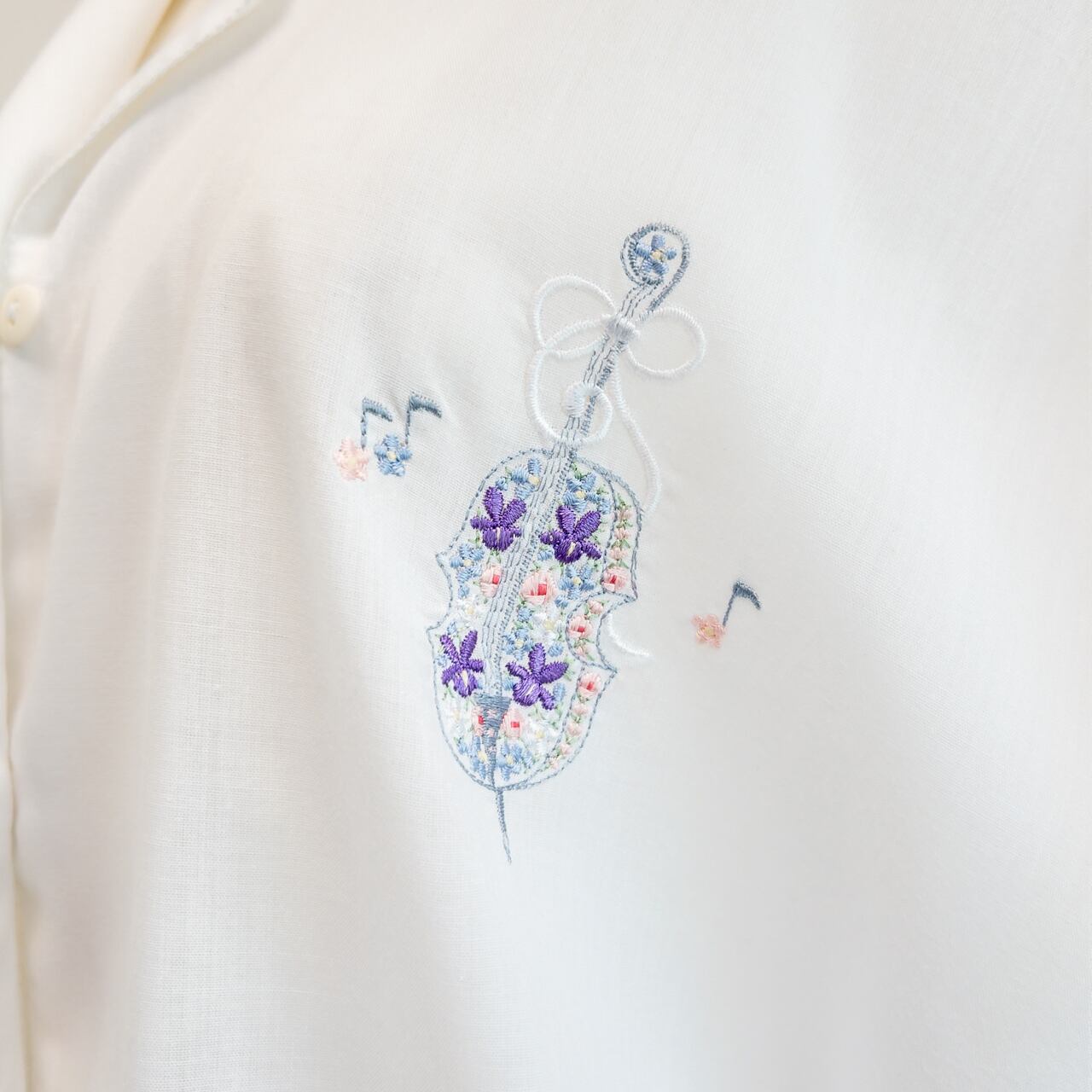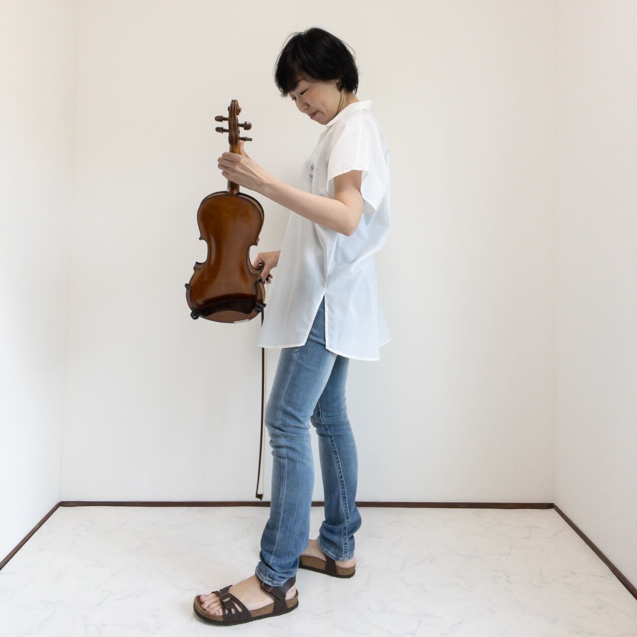 とても楽しそうに音を奏でているチェロの姿を、わたしはすっかりバイオリンと見間違えて、こちらのブラウスを空服に迎えました。