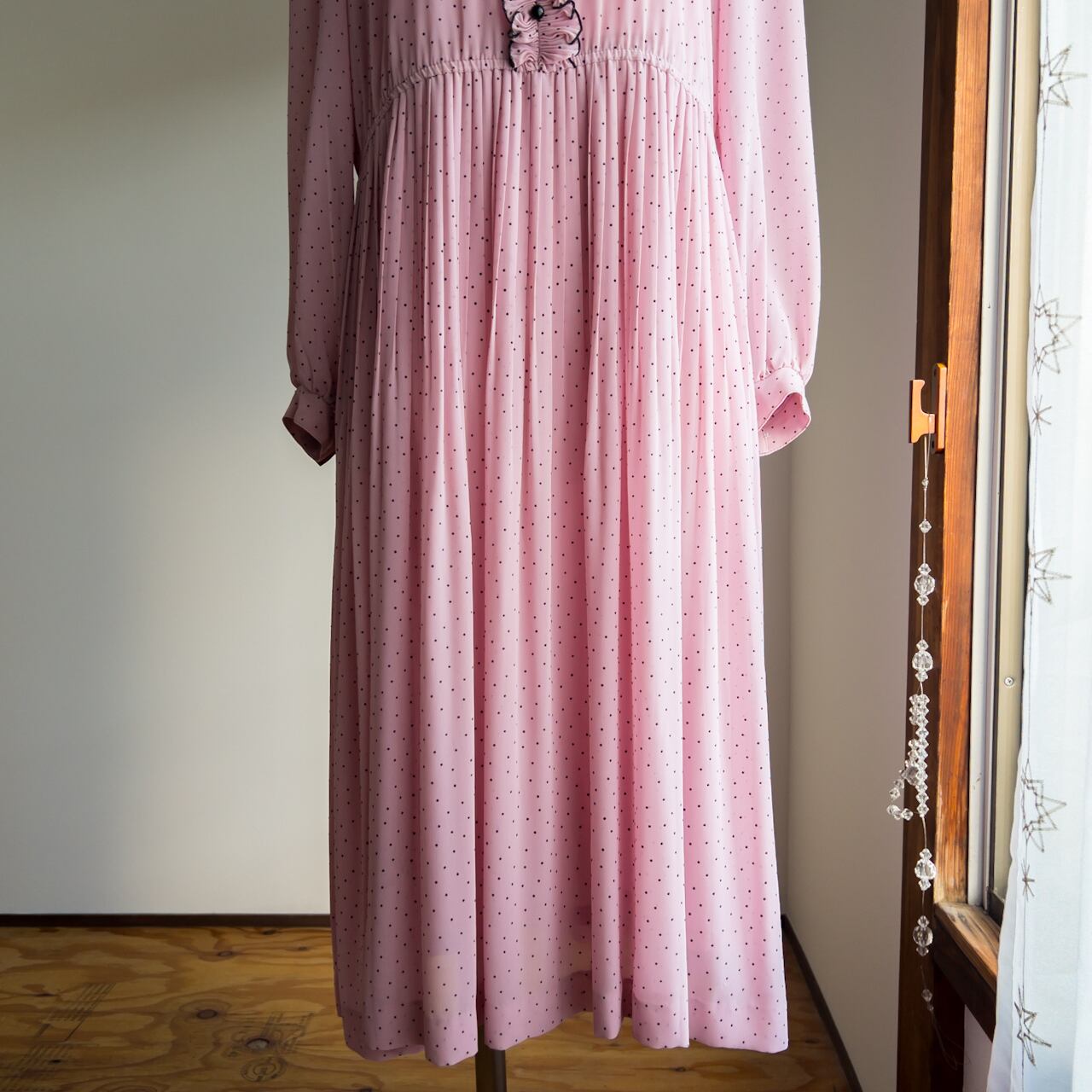 くすんだピンクに、触って初めて分かるくらいの立体感のある黒のドット柄の生地。