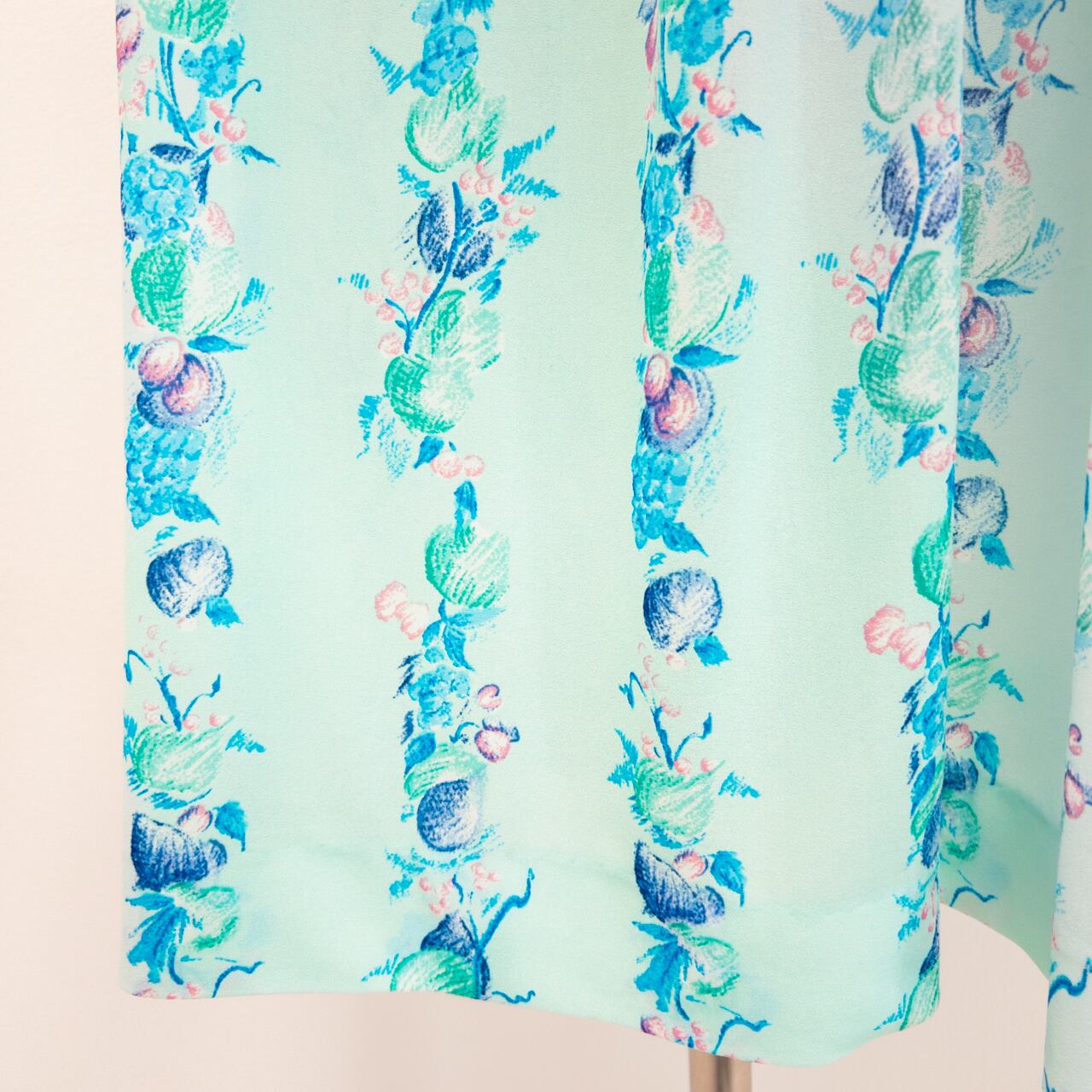 肩からウエストにかけて入っているギャザーと、縦に並んでいるぶどうやあけびのようなフルーツの柄がとてもステキです。