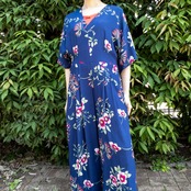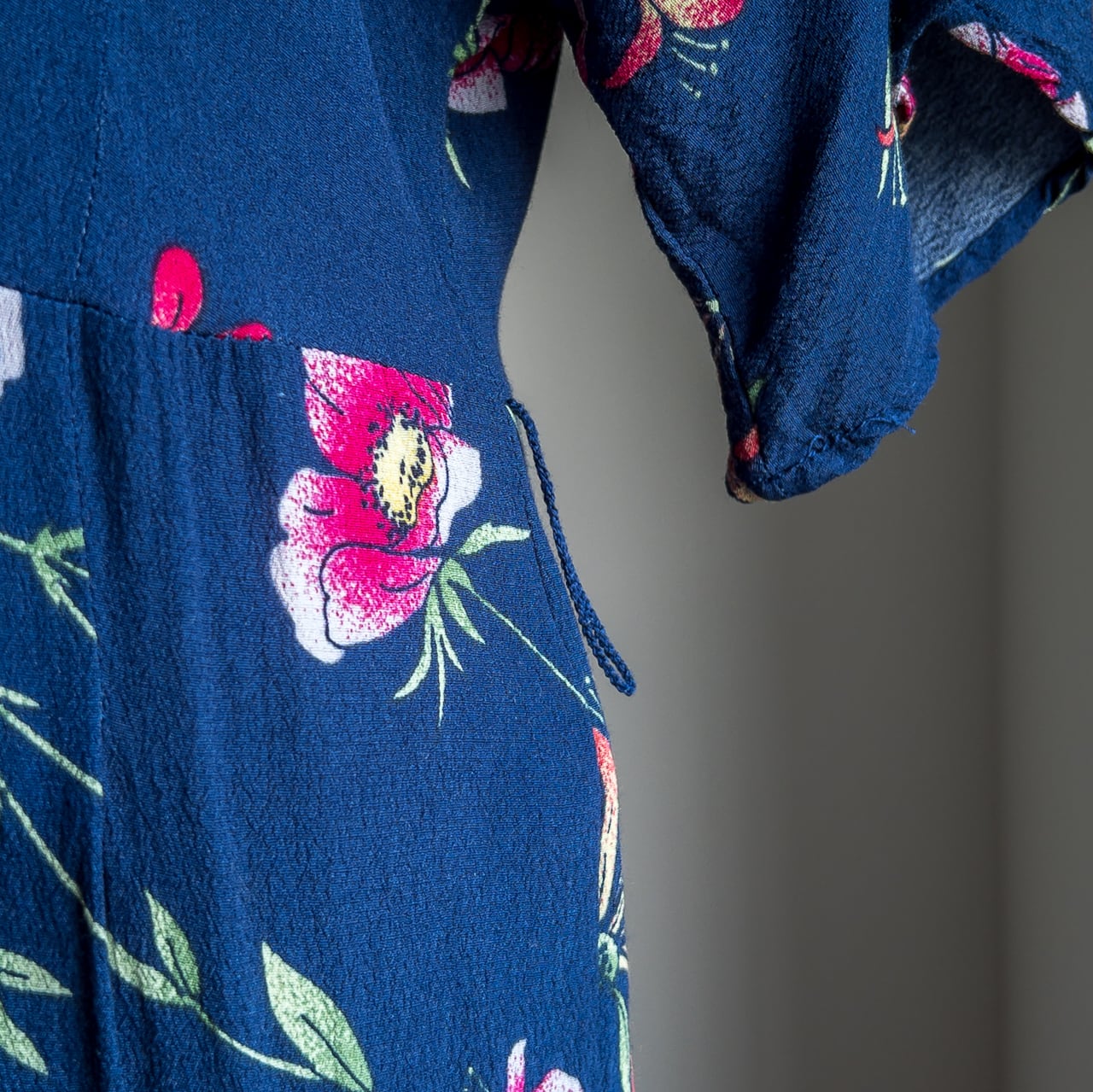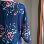 紺色の地に、ハマナスようなピンクのお花と、花火にも似たハエマンサスのようなお花が描かれています。