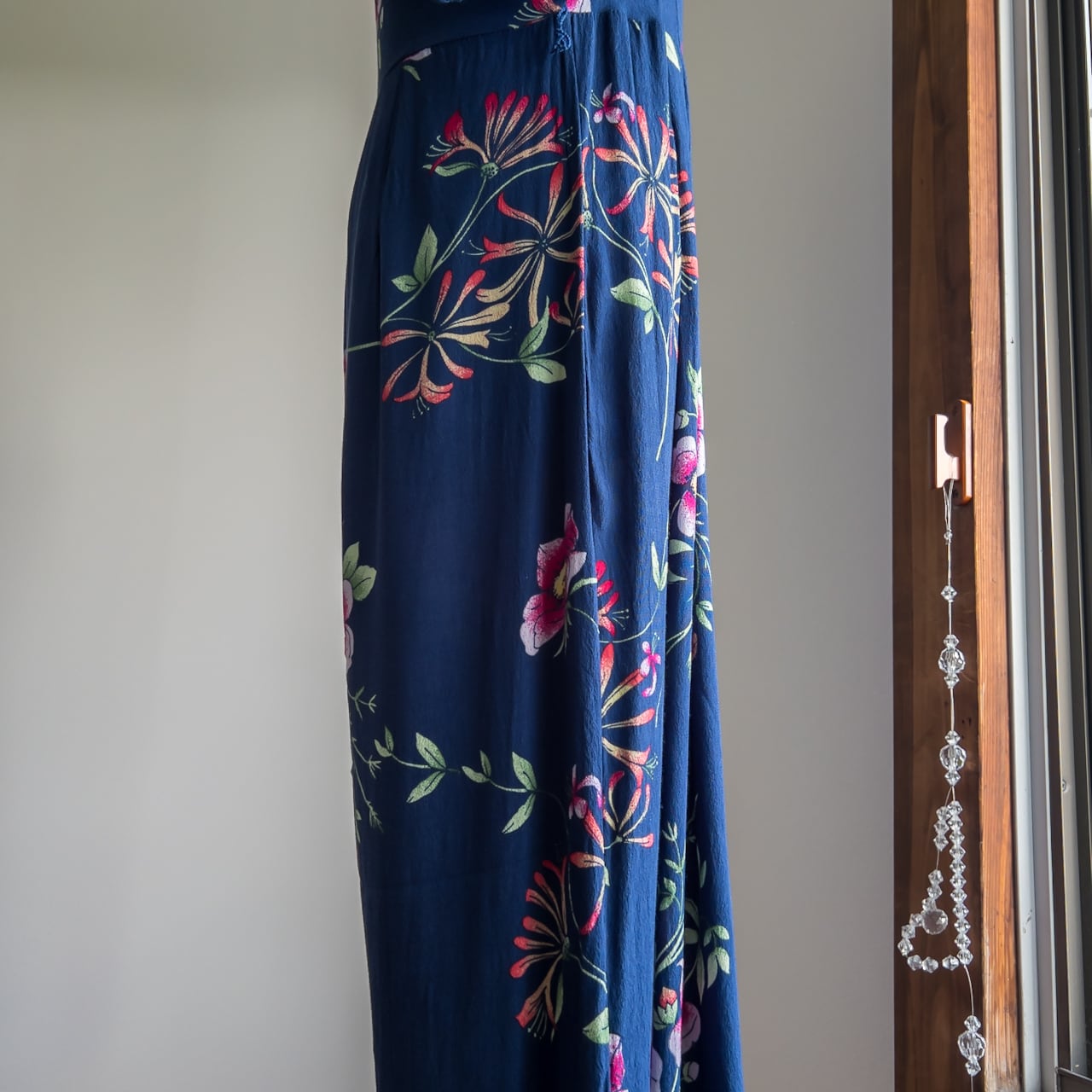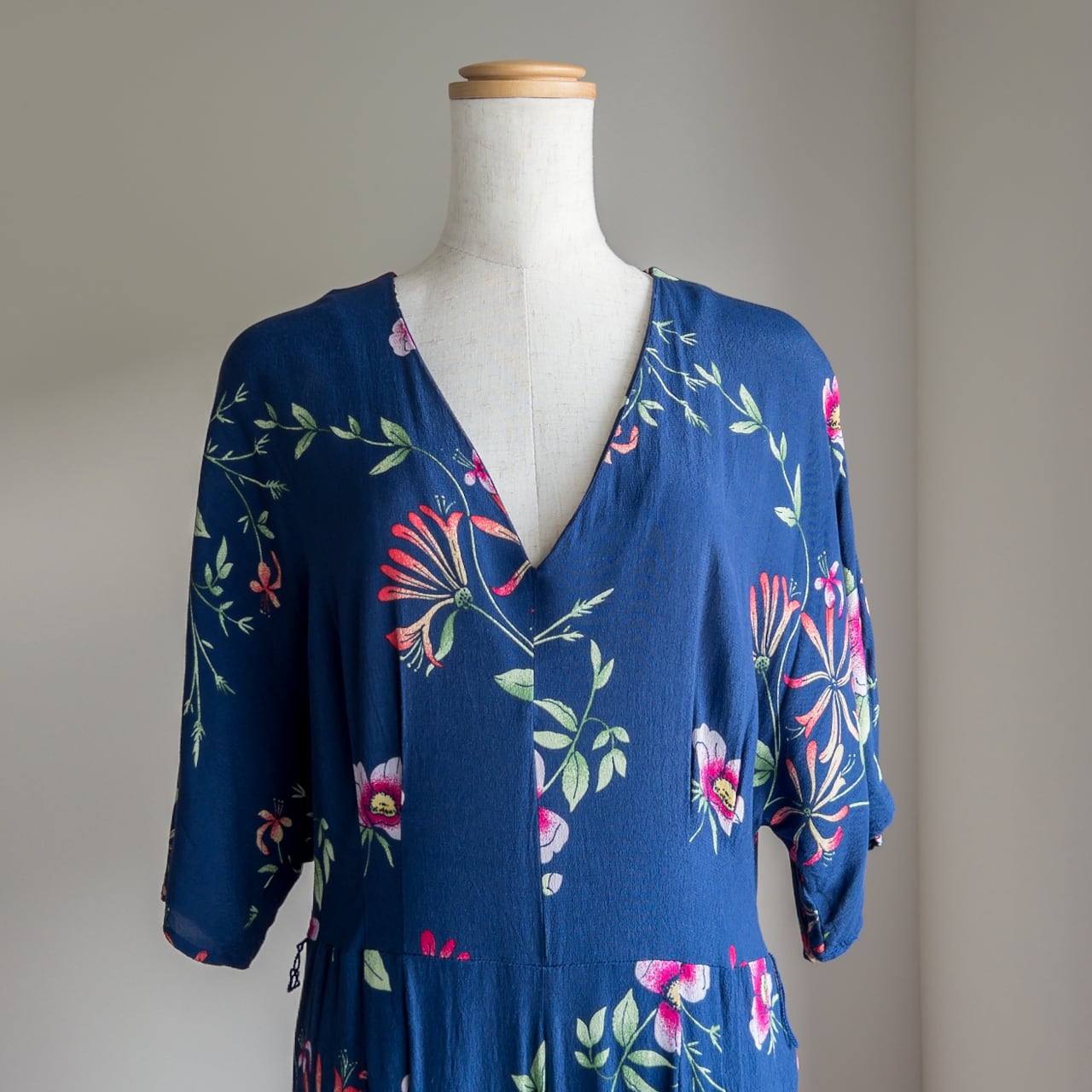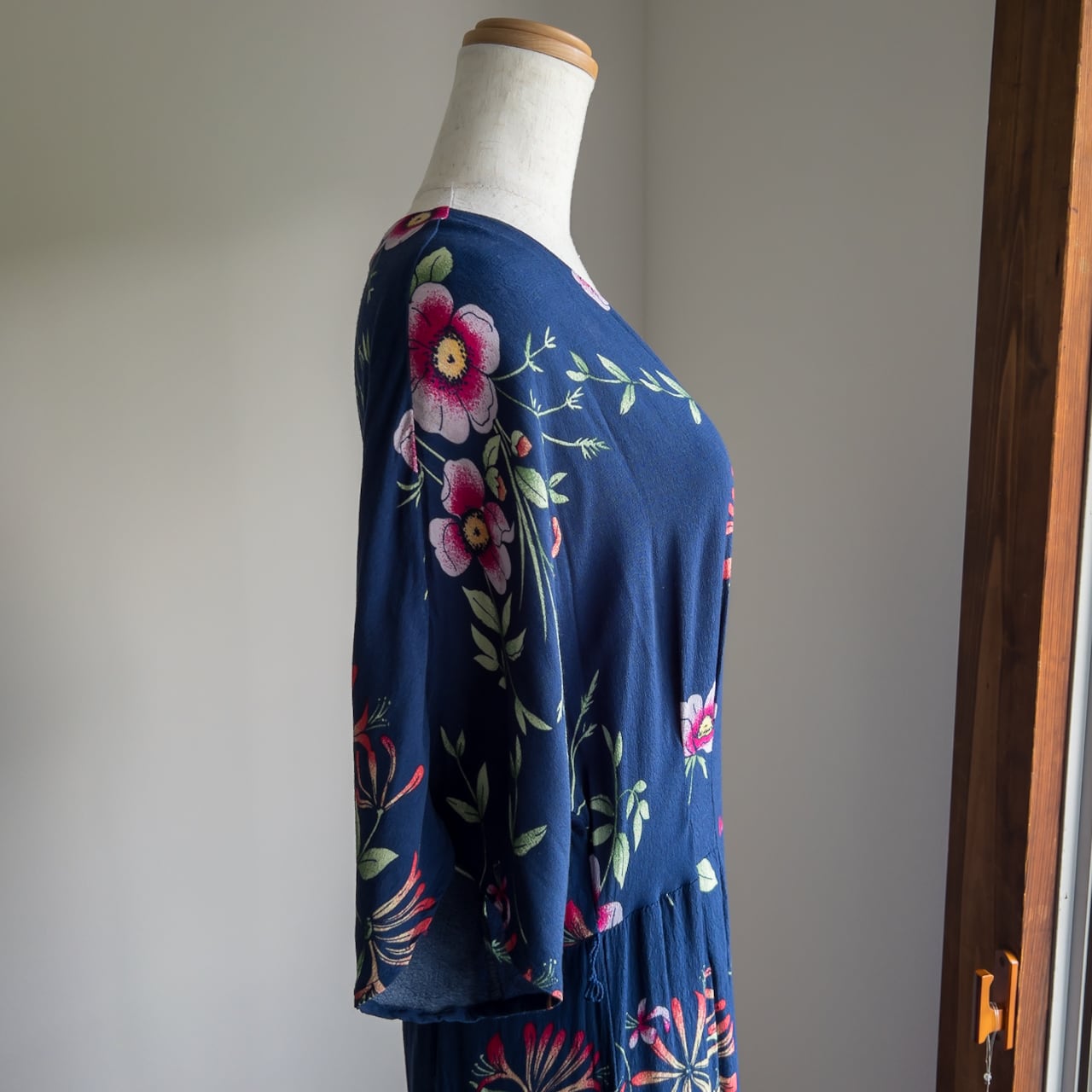 こちらの服は身体を締めつけない、ゆったりとしたサイズで風も通りやすいですし、生地はシャリ感のある織りのレーヨンなので、肌に触れるとひんやりとして涼しいです。