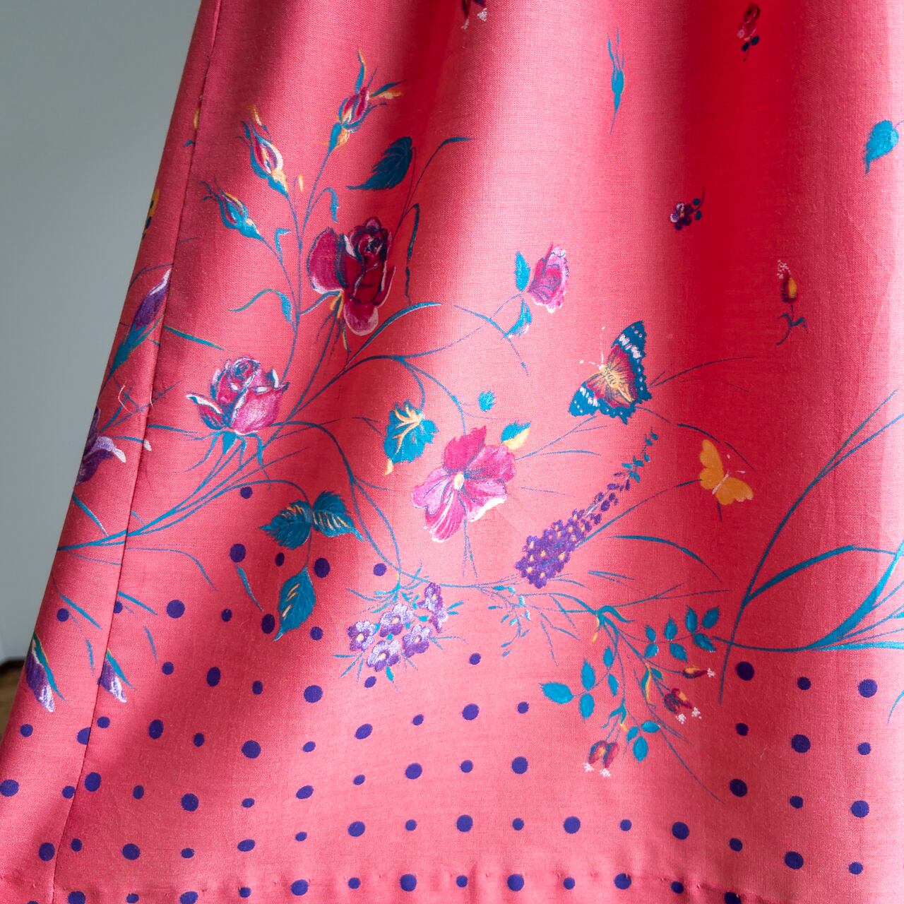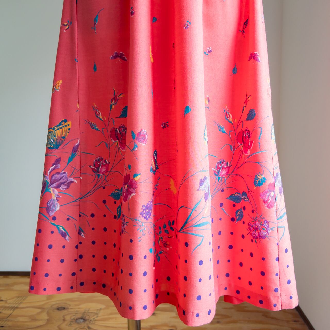 生地は、オレンジとピンクが混ざったような色の地に、紫と黄色や赤いお花や蝶々が描かれています。裾のあたりには紫の水玉模様が描かれています。