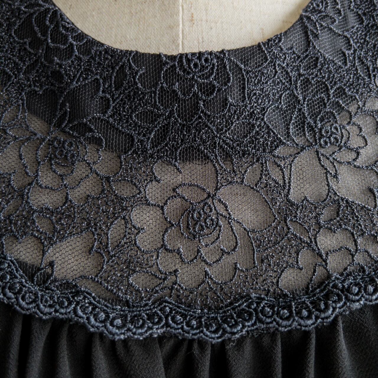 前身頃の首周りには、少し紺色にも見える糸で作られた薔薇のレースがつけられています。