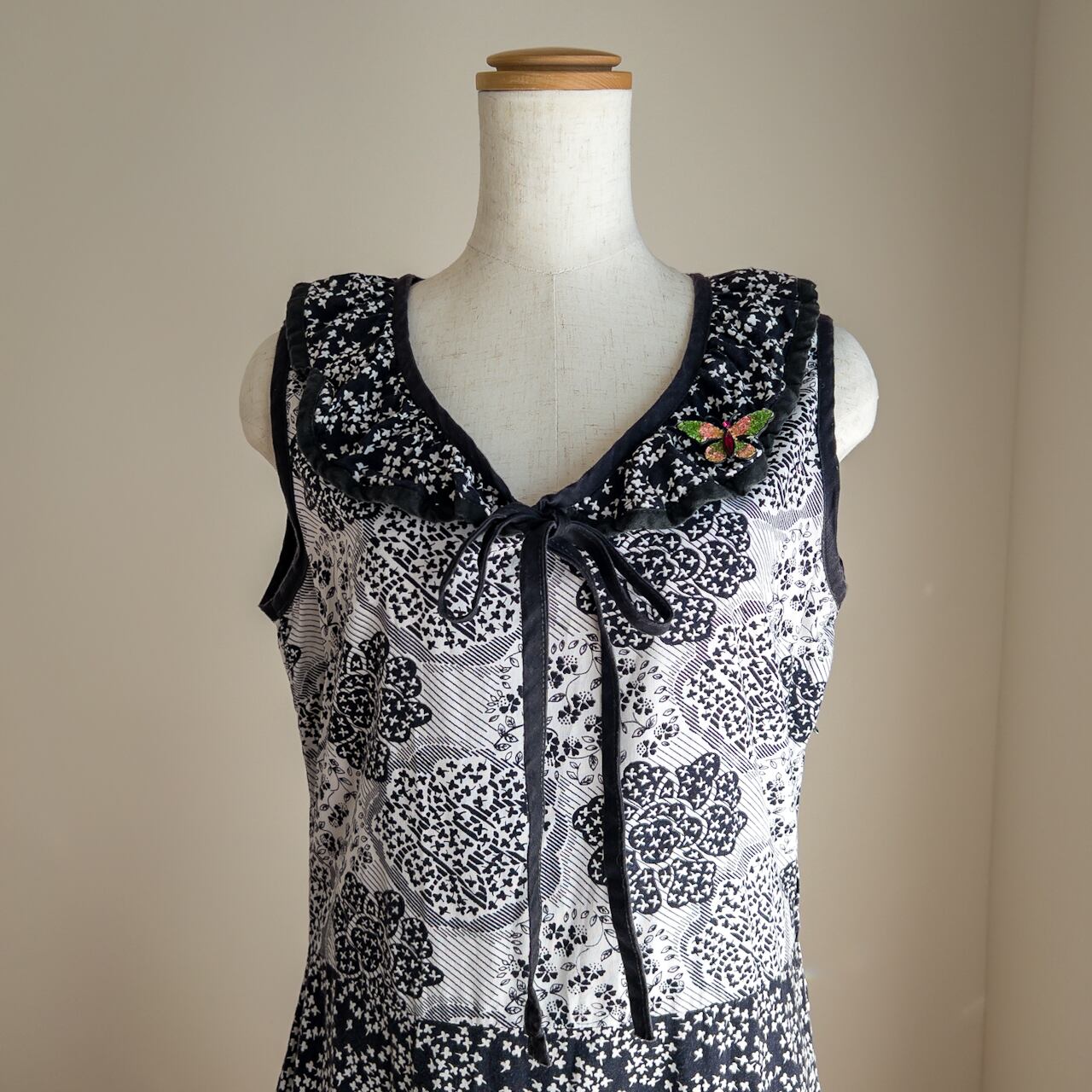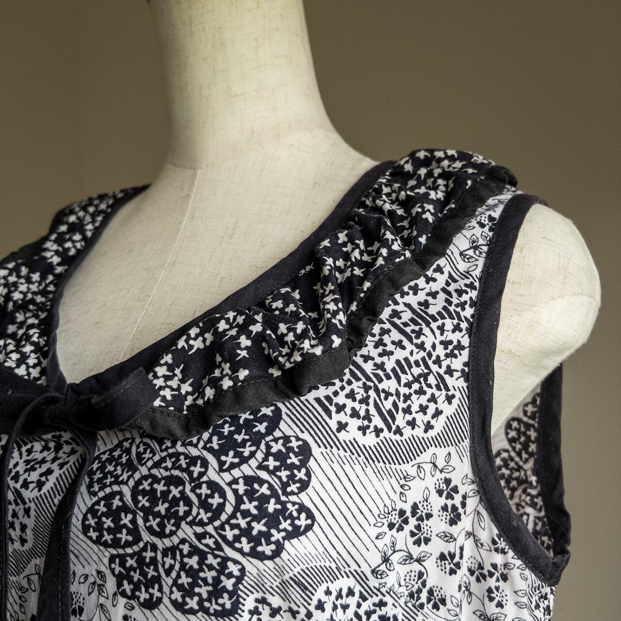 襟を縁取っている黒い生地は、リボンに変わって結ぶスタイルになっています。