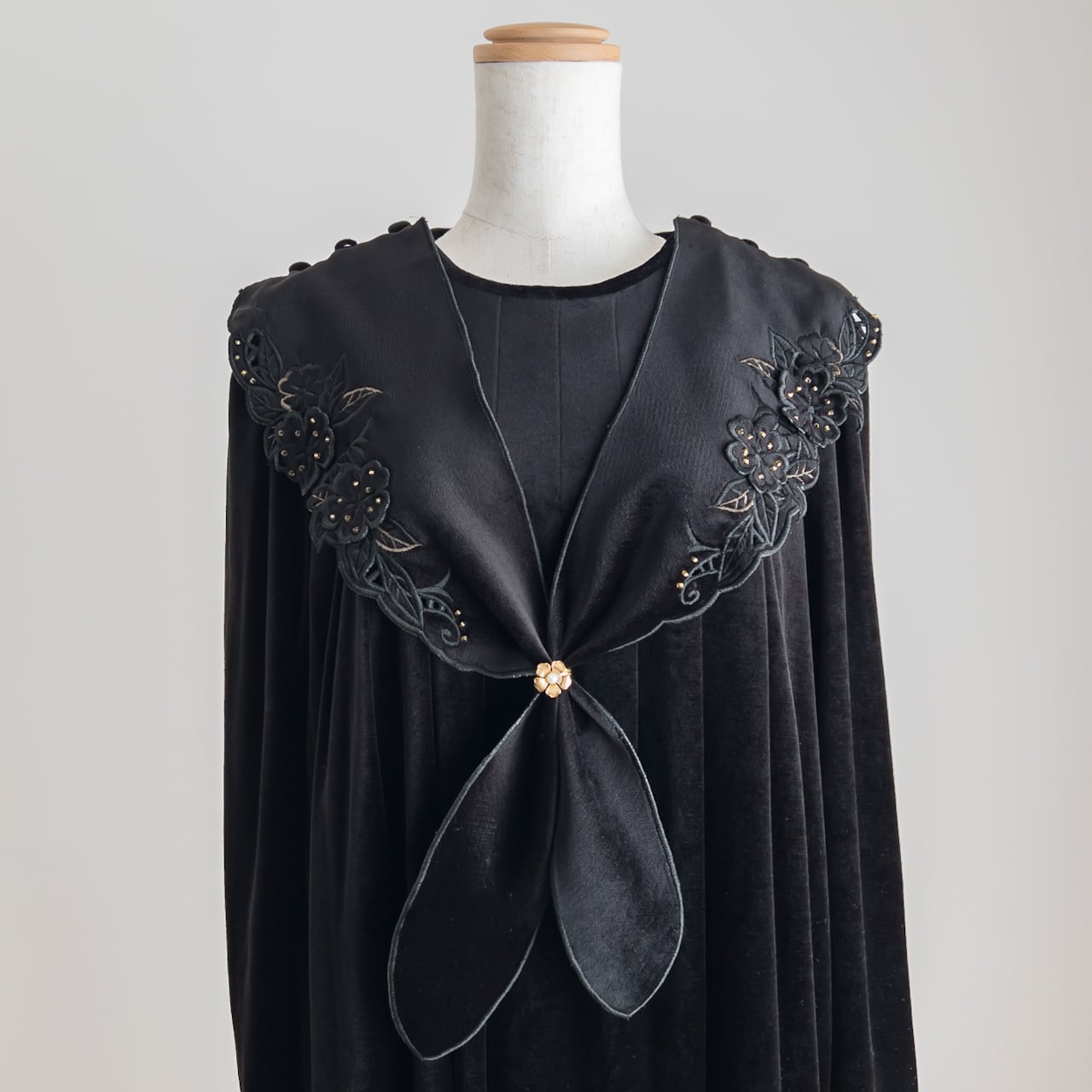 黒一色のワンピースにささやかに散りばめられいるこちらの装飾はとても上品で、セーラー襟とそれをまとめているかわいらしいお花の指輪が懐かしく、少女であったあの頃を思い出して心をくすぐります。