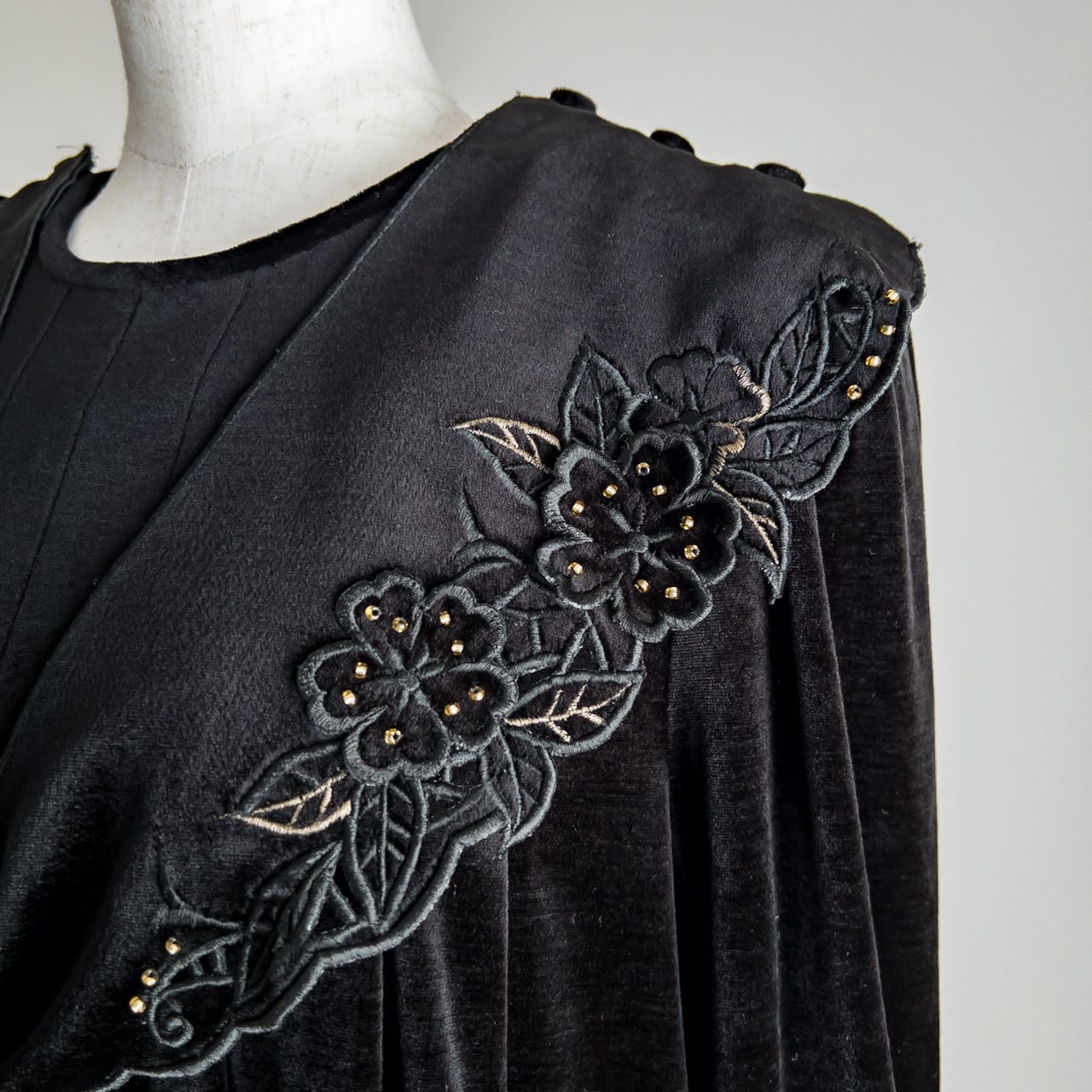 セーラー襟には、黒と金色がかったモスグリーンの刺繍、金色のビーズ