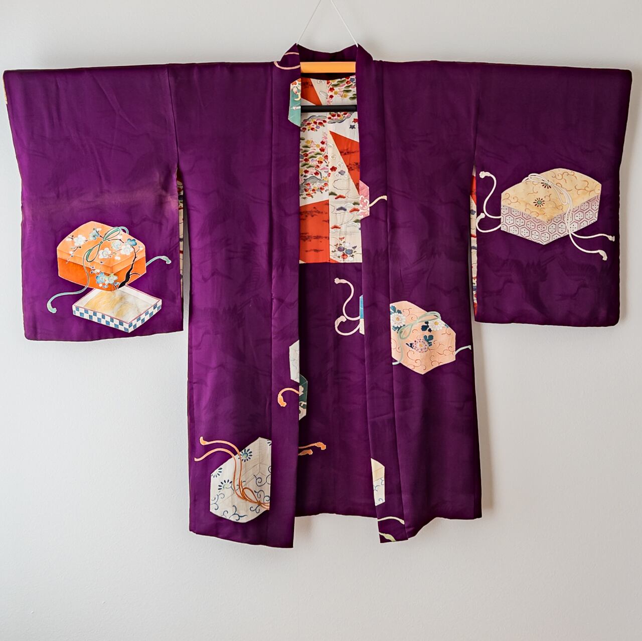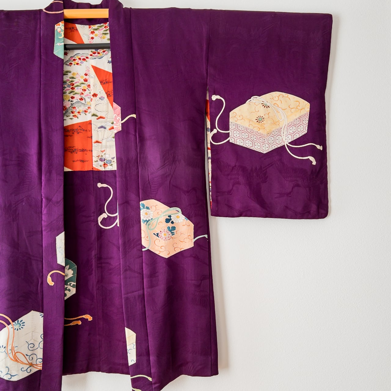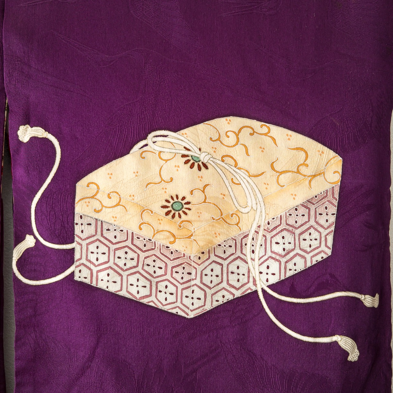 紫色の表地には鶴の模様が織られており、その上には、とてもきれいでかわいらしい色とりどりの玉手箱が描かれています。