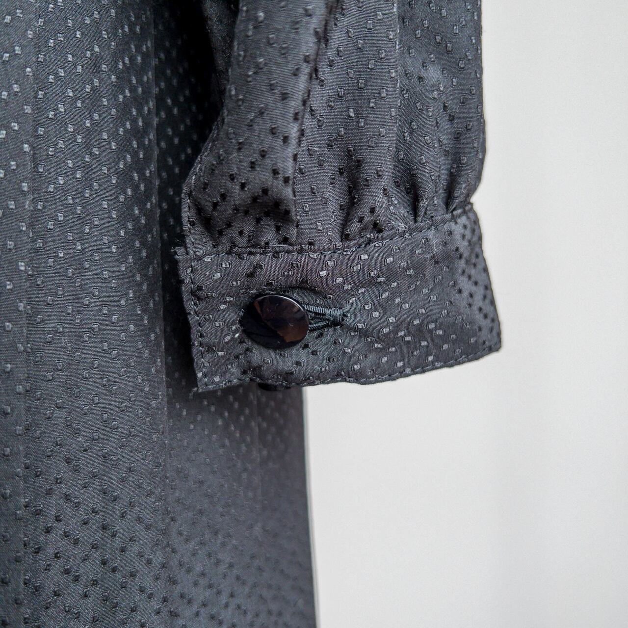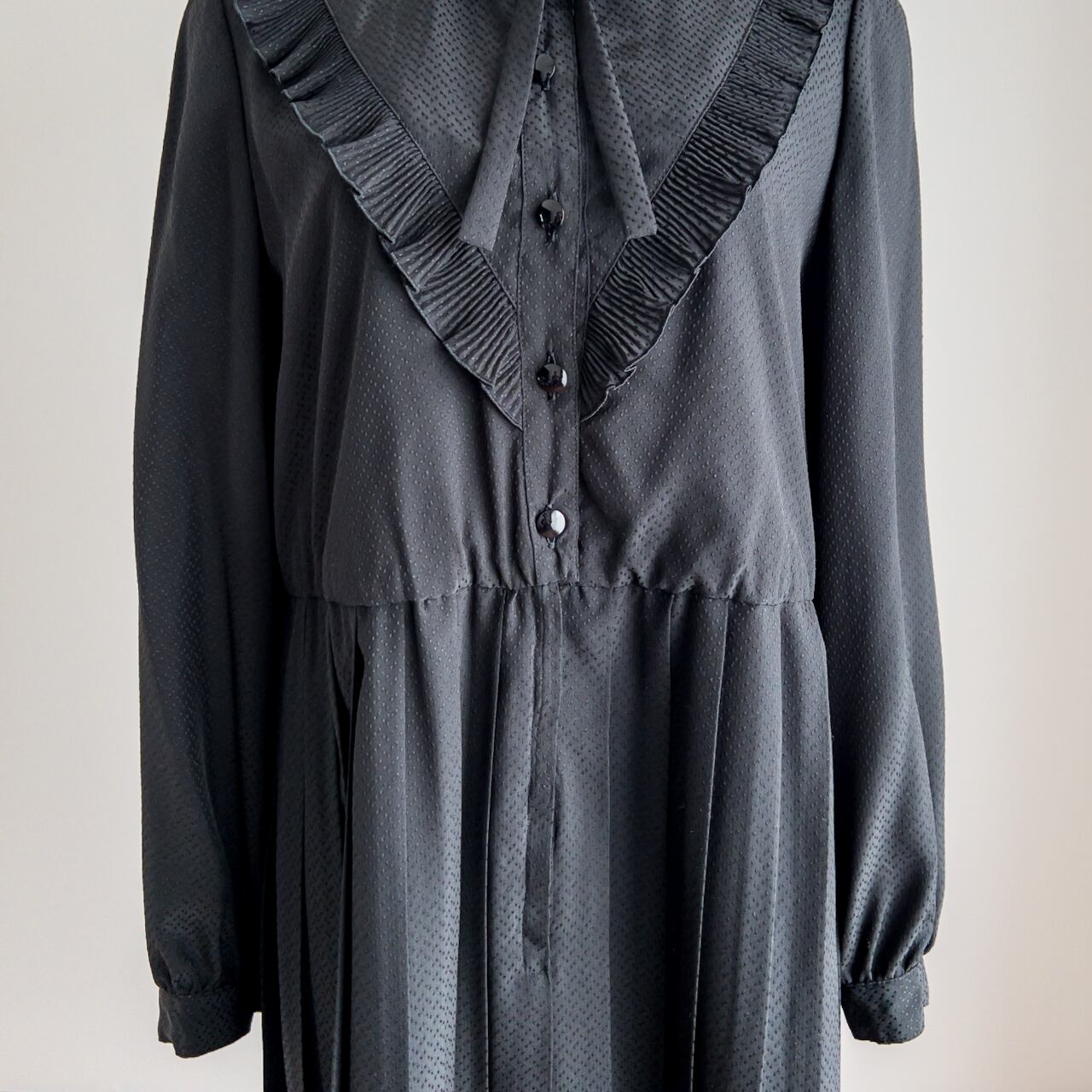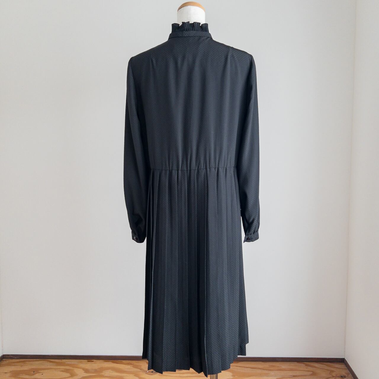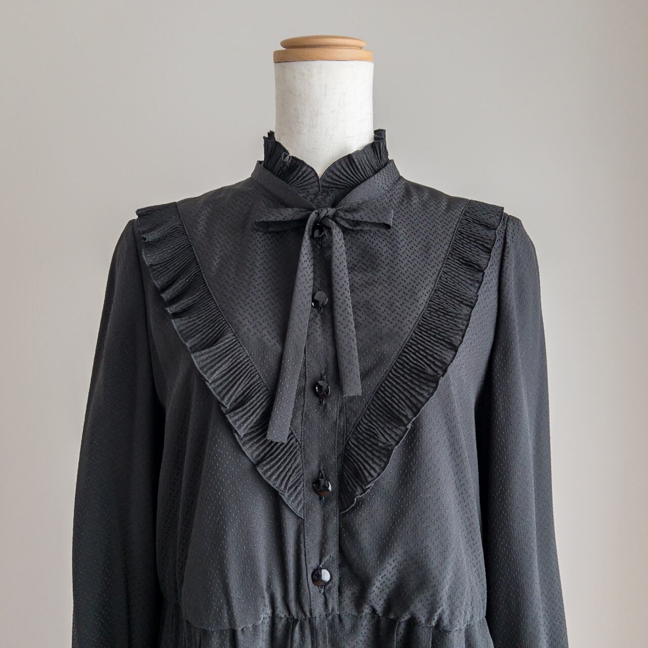 黒一色のハンサムなカラーの服ですけども、ストンとした形とふわっと広がるプリーツスカートが何とも表情豊かでかわいらしく、リボンやフリルの胸元のデザインも、日本古着らしい、とってもモダンな雰囲気です。