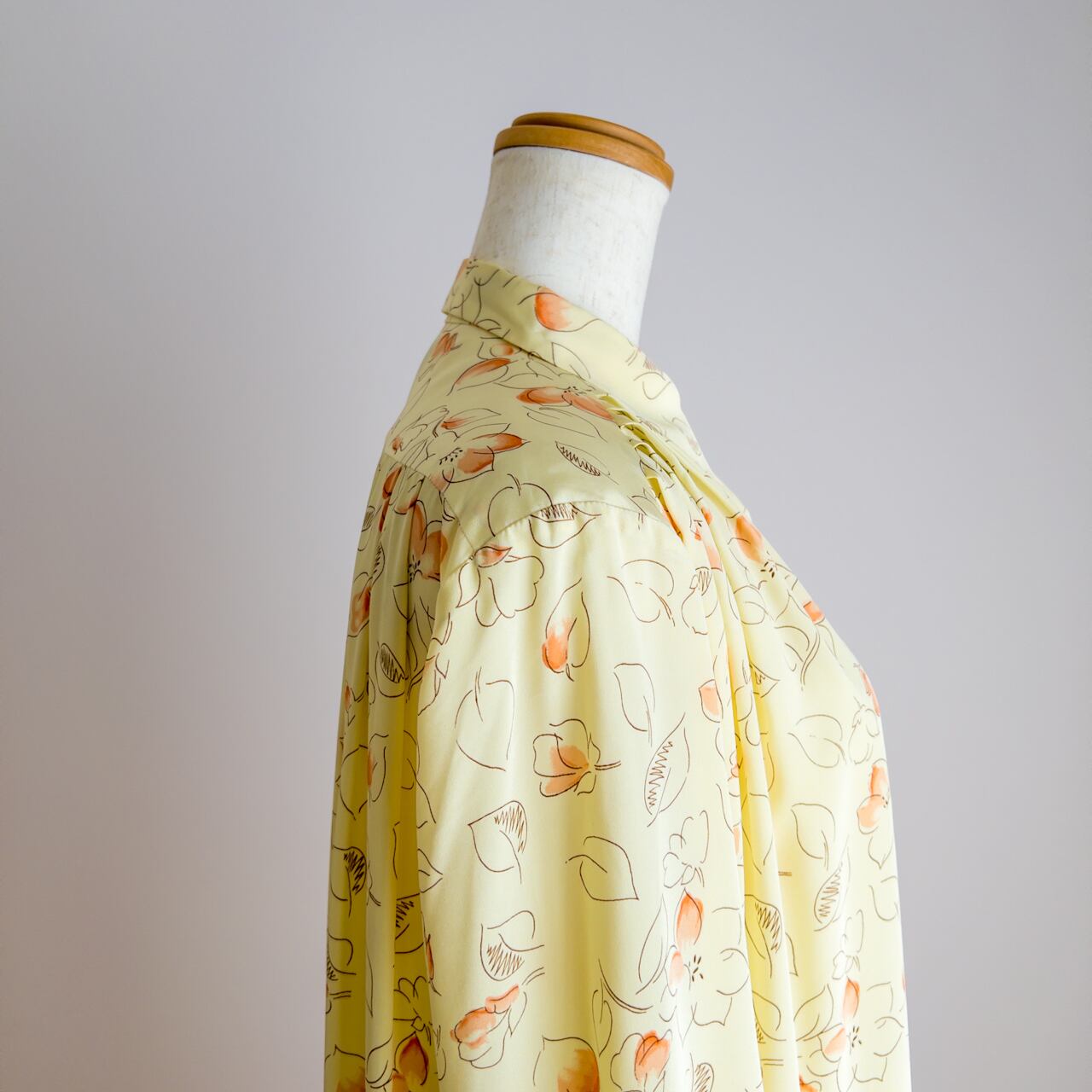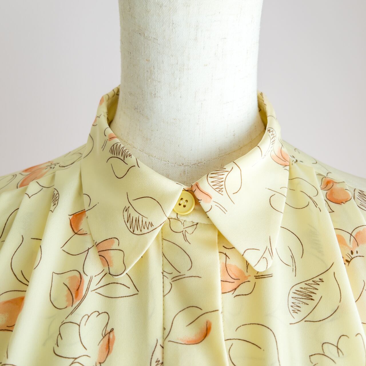先が丸くなっているかわいらしい小さな襟から裾に向かって約50cm下まで、プラスチック製のクリームイエローのボタンが付いています。
