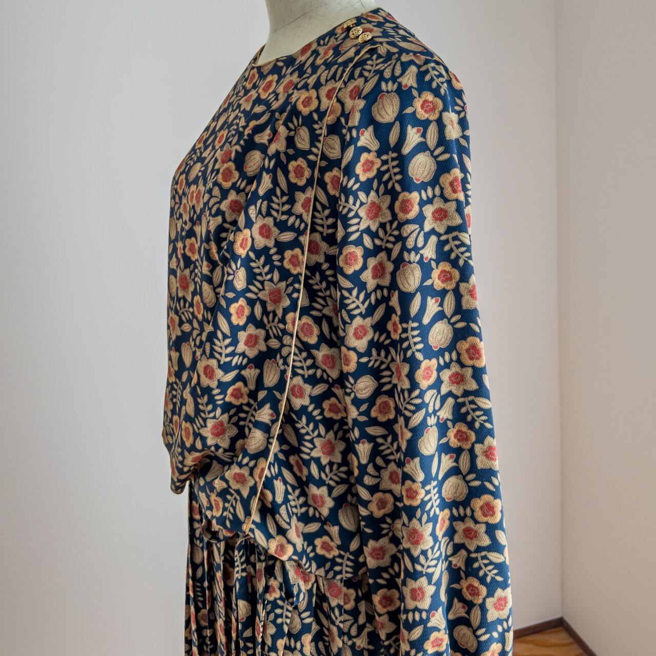 ドレープの縁と首周りにはゴールドの縁取りがされていて、柄の色合いのまとめ役になっています。