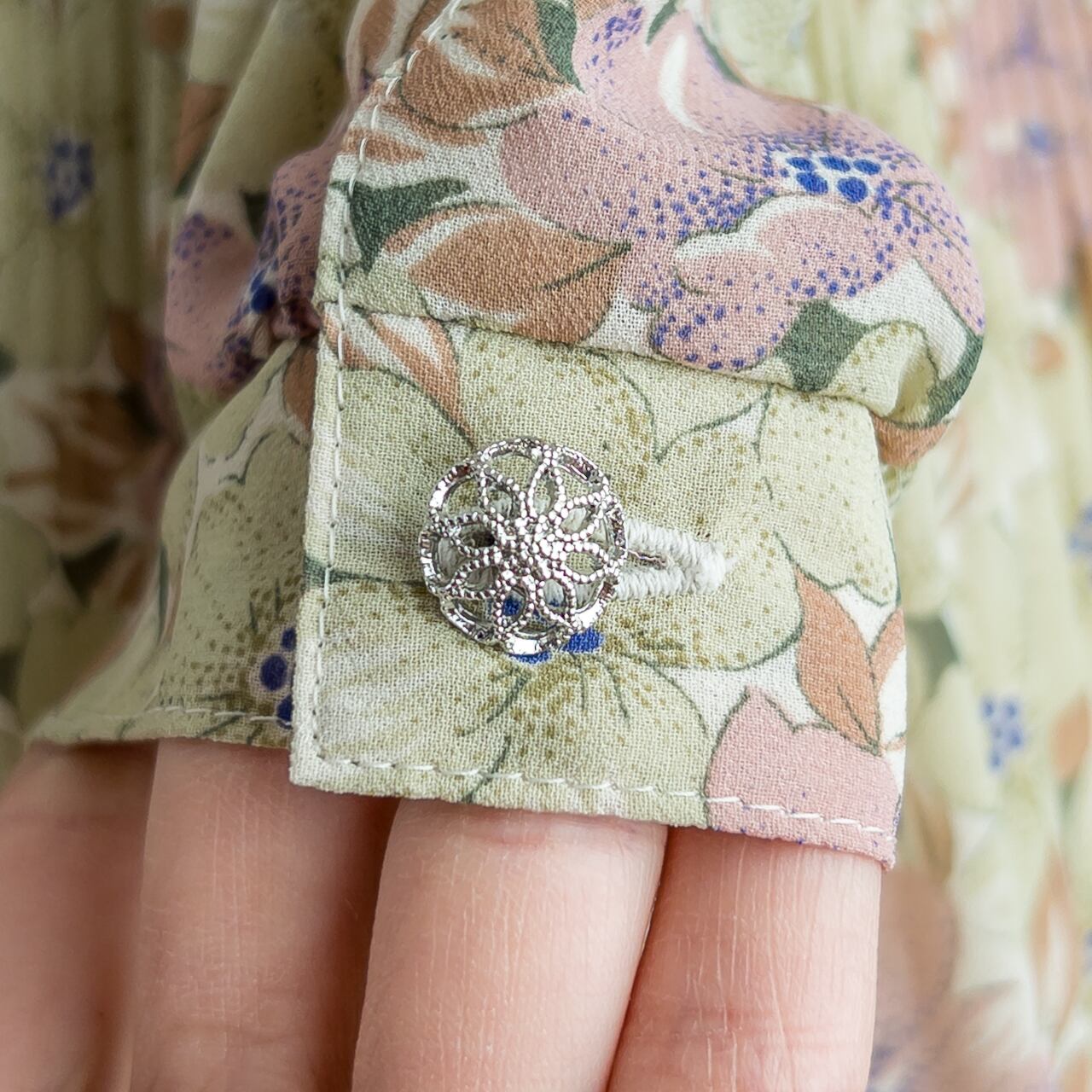 ですので、こちらのワンピースには、その雰囲気にピッタリの銀色のボタンをプレゼントしました。