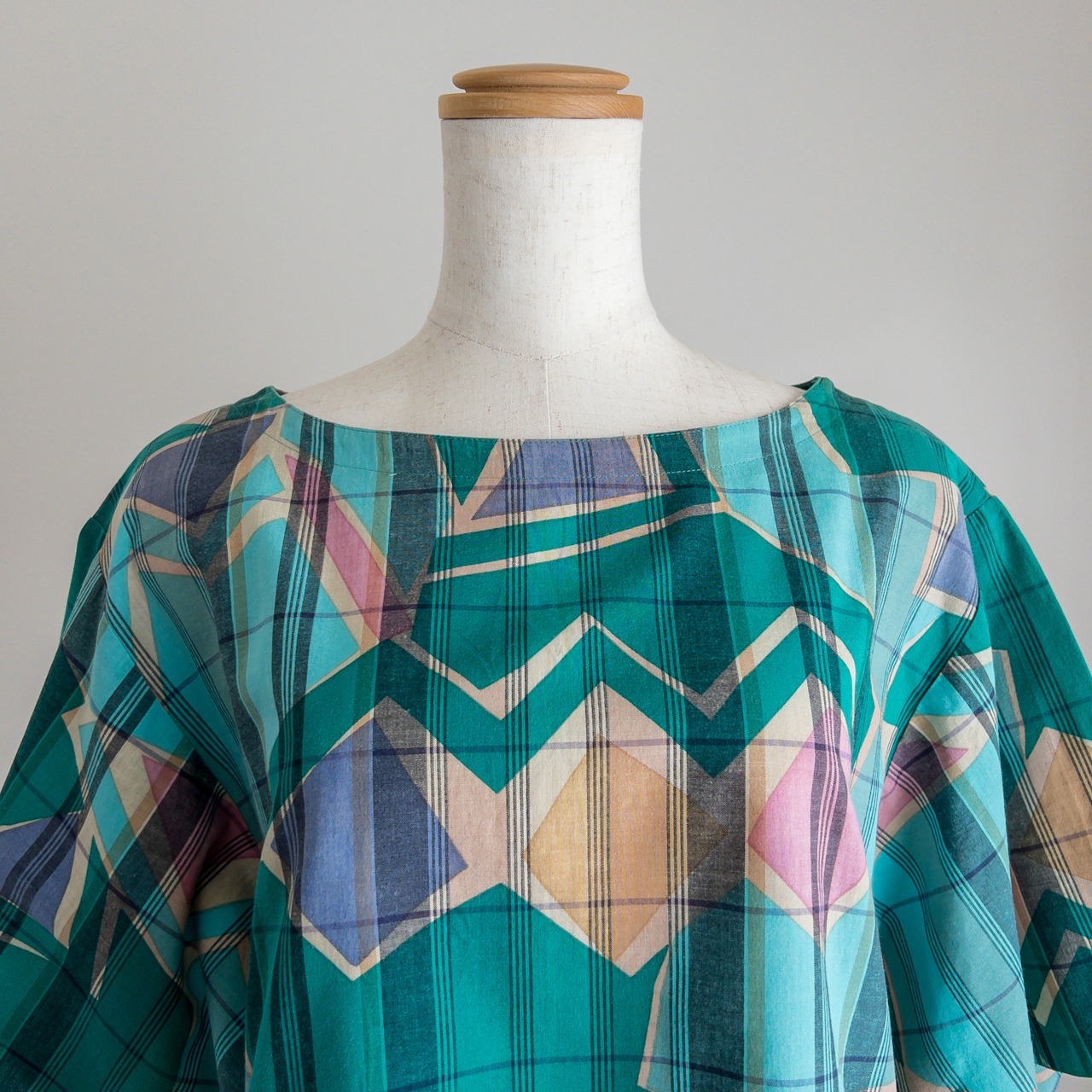 生地の模様に合わせたように、ブラウスの身頃の形も四角。襟周りもボートネックで、幅が広めの袖の形も四角と、ブラウスのパーツは直線を使った形で統一されています。