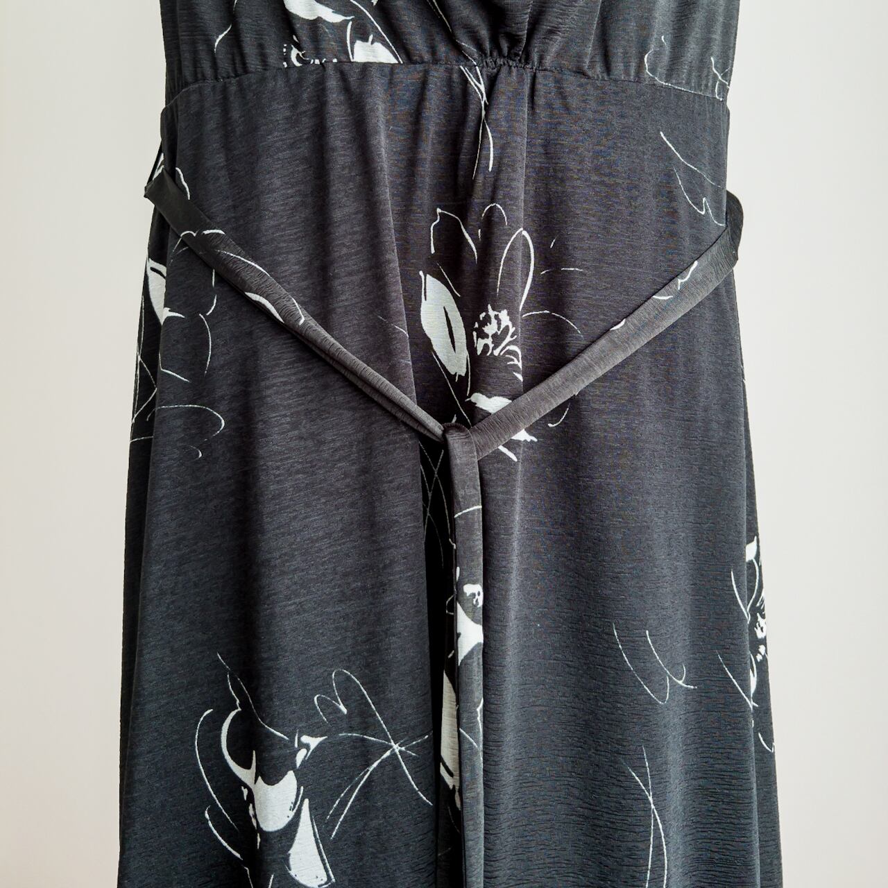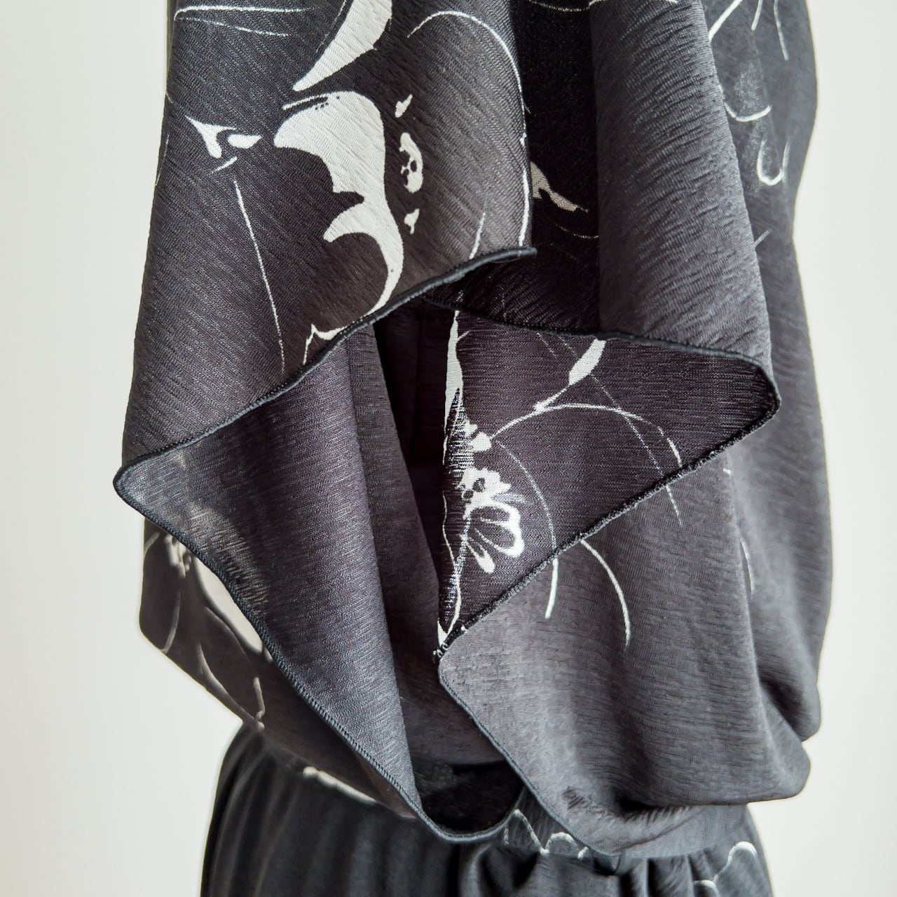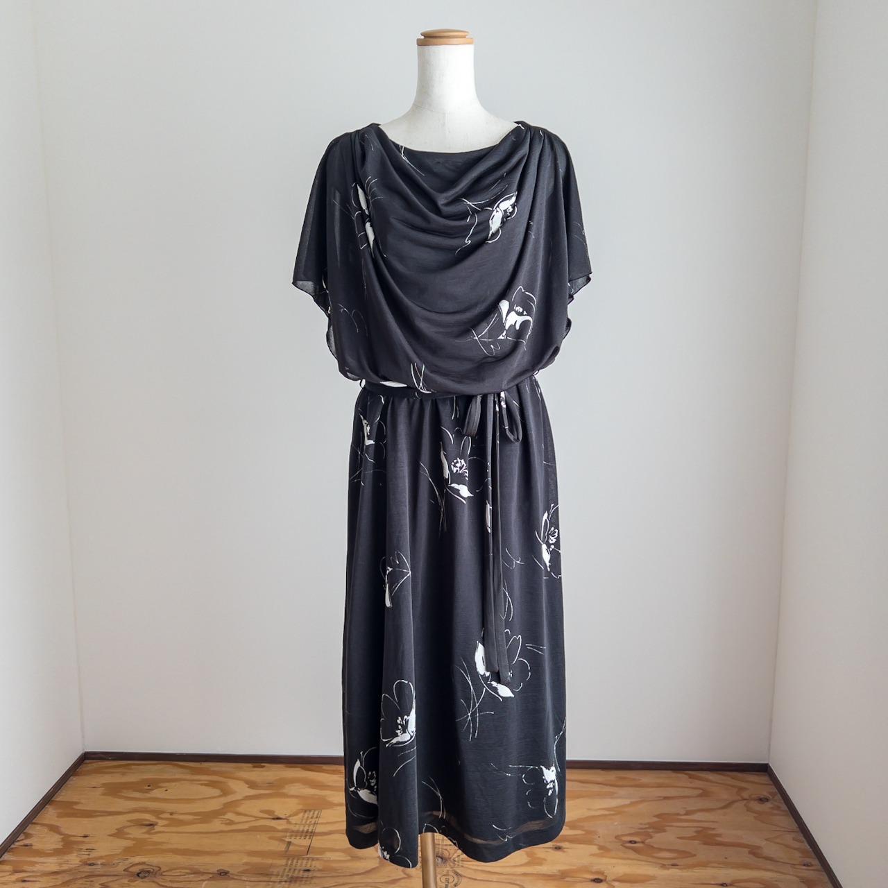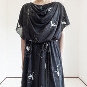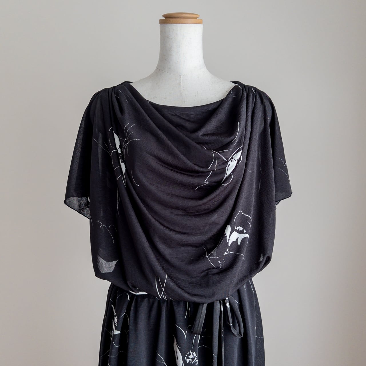 先の細い万年筆のようなタッチで描かれている花は、大きすぎず、小さすぎず、ワンピース全体をとてもシックな雰囲気に魅せています。
