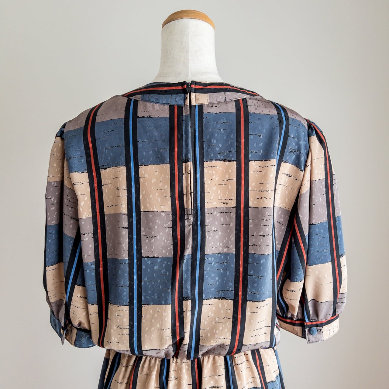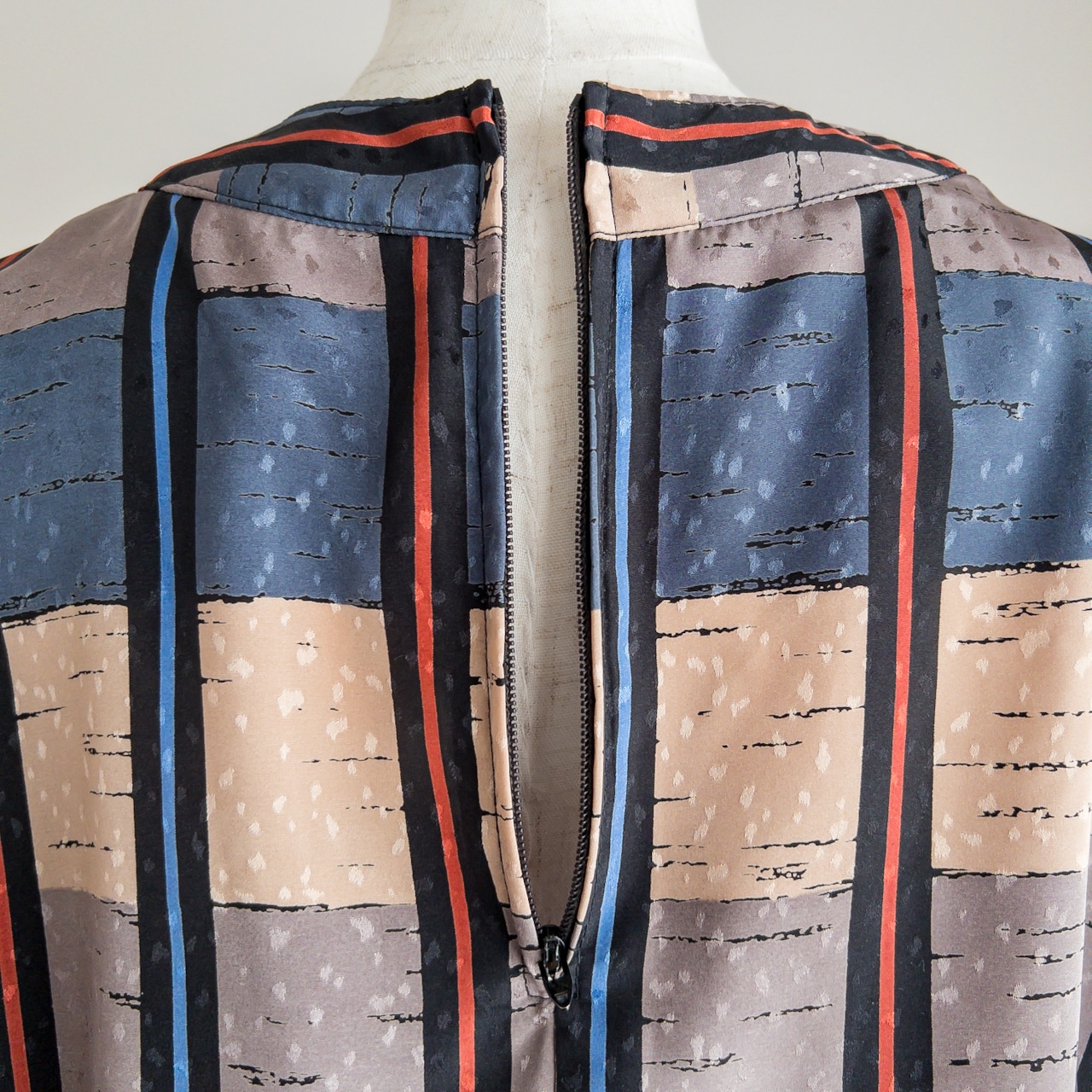 襟はボートネックに近い形の丸襟で、身頃や袖の部分とは逆方向に布を配置してあります。