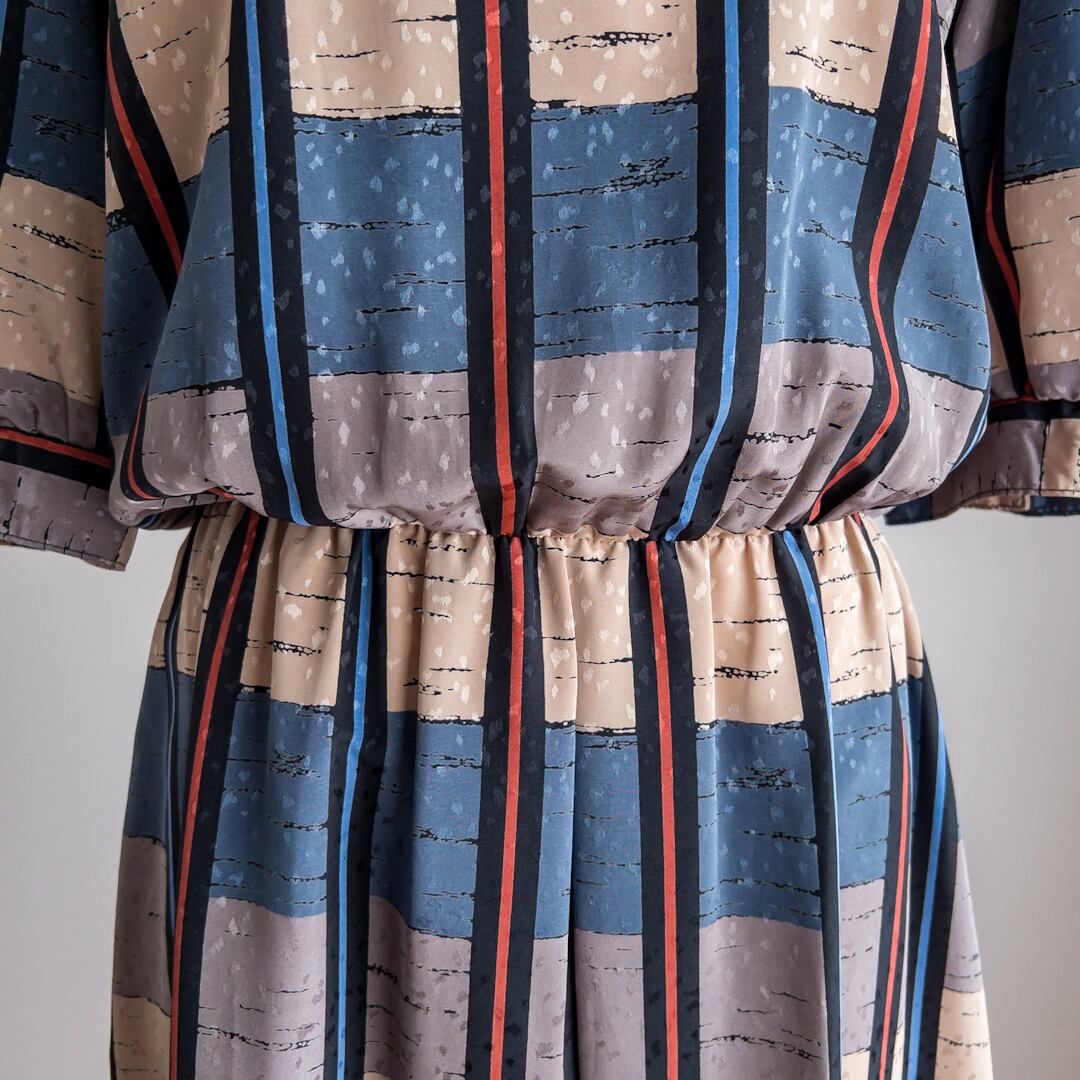 ツルツルした肌触りの、ポリエステル100%の生地で作られているワンピースです。