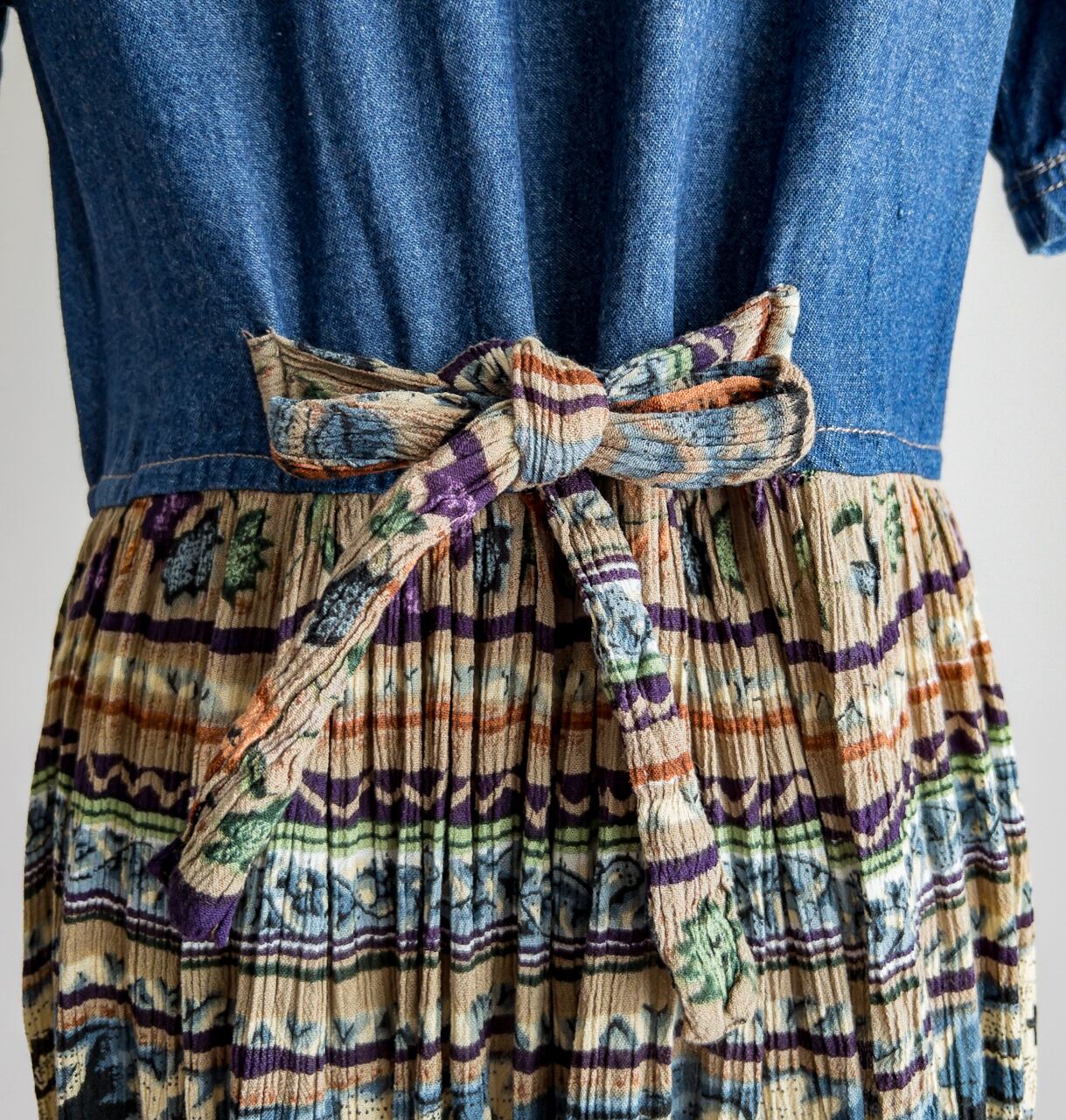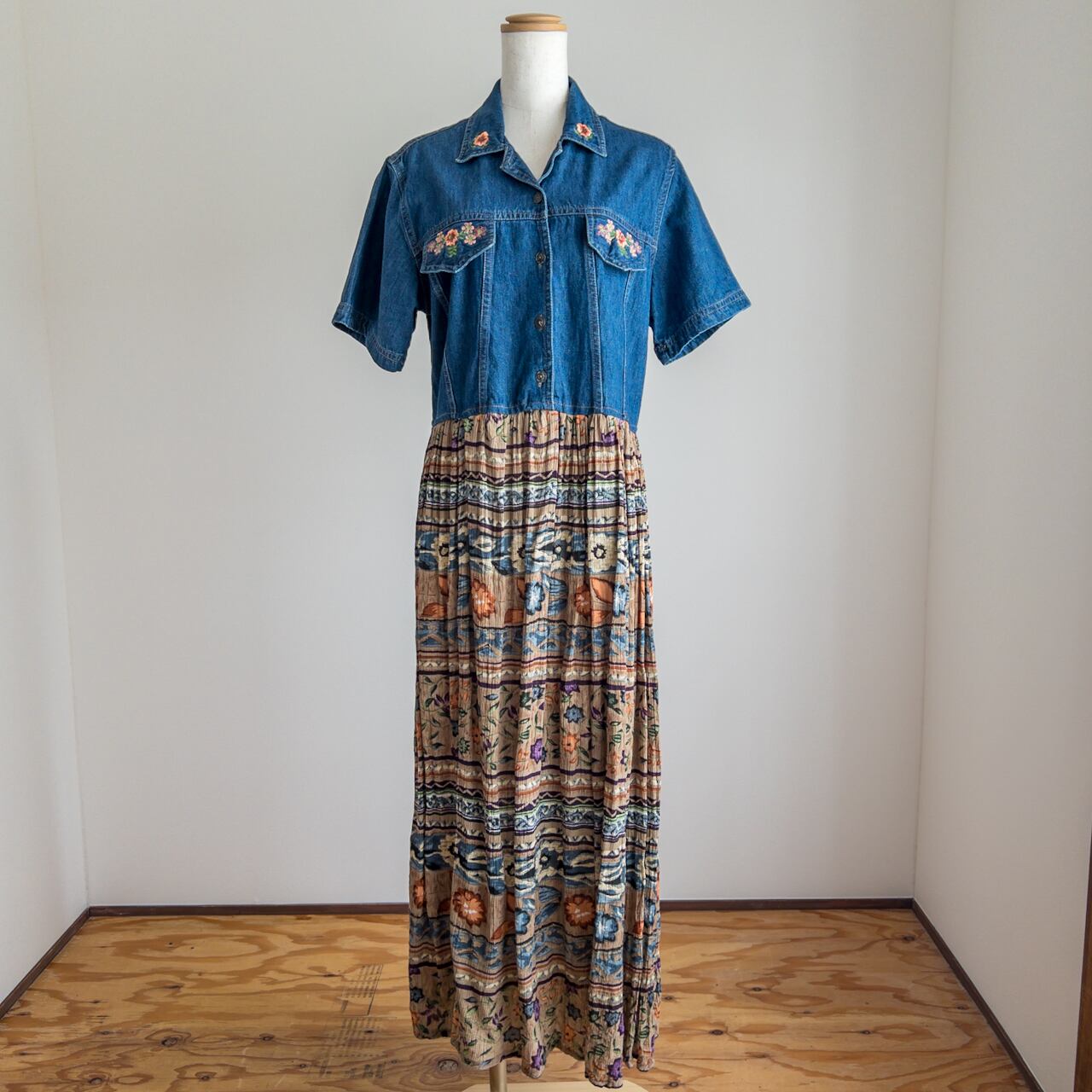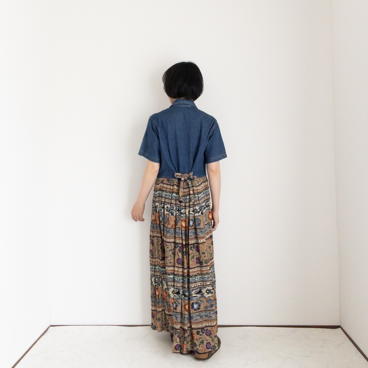上衣は薄手のデニムで、ボトムはエスニックな雰囲気のスカートになっているワンピースです。