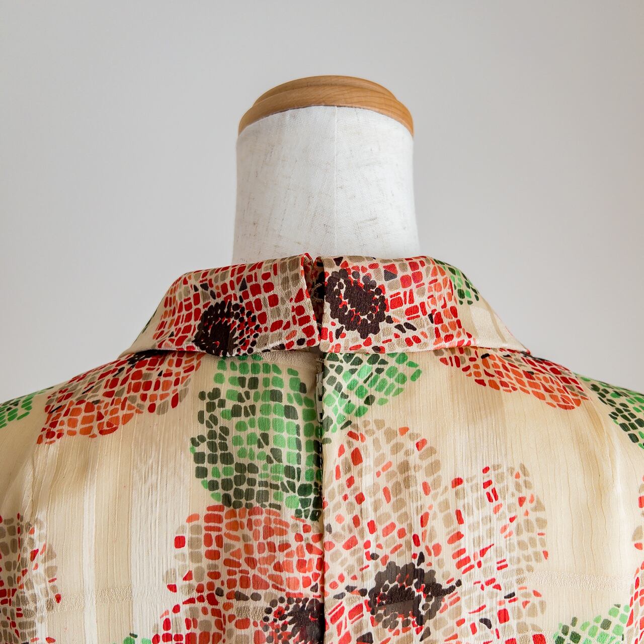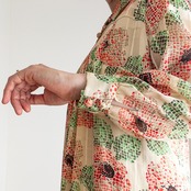 赤、サーモンピンク、カーキ、緑、黄緑色、焦茶色のお花の絵柄