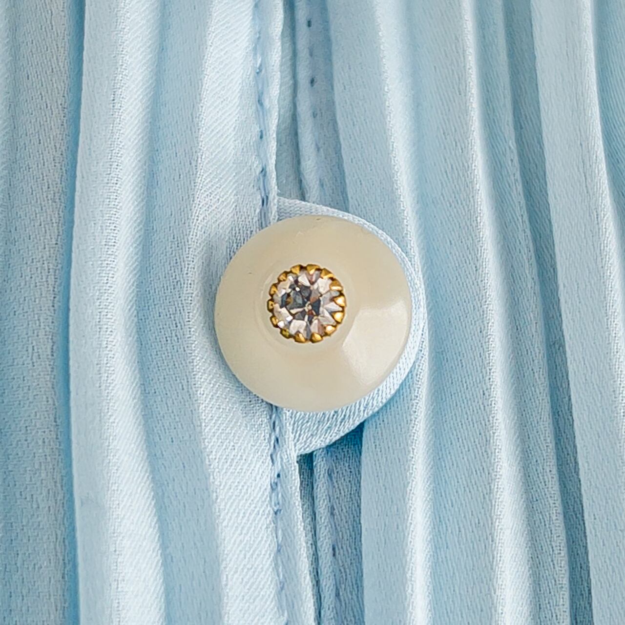 襟の一番上からウエストにかけて付いているパール色のボタンの真ん中には、金色の縁取りがされている透明のラインストーンが付いていて、レトロな雰囲気を醸し出しています。